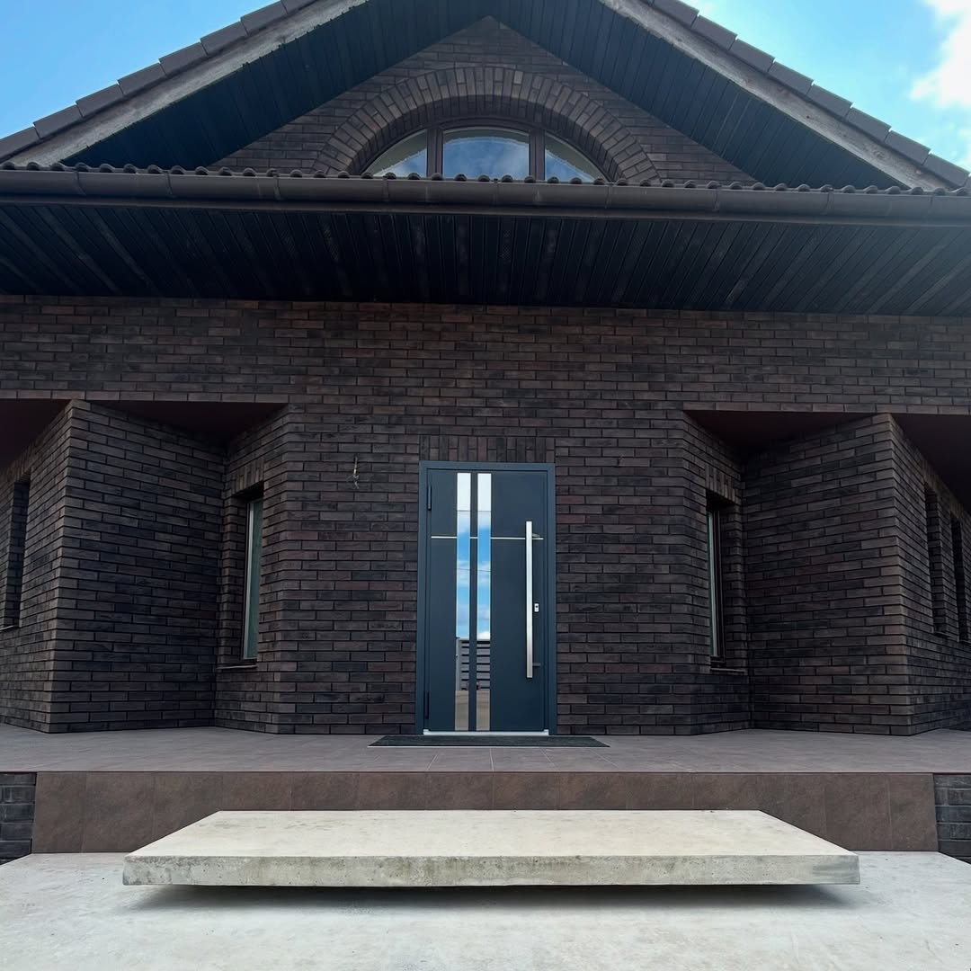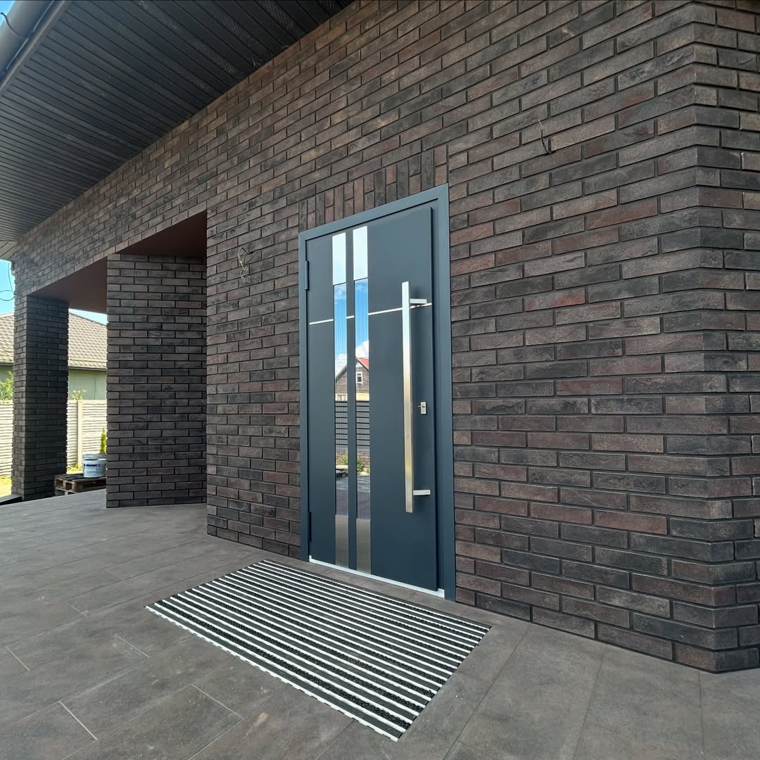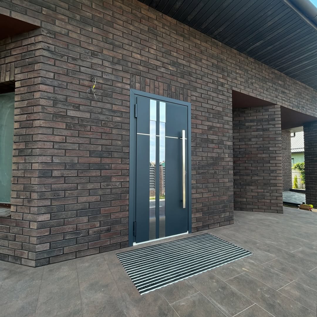 Дверь А-035 с ручкой-штангой на фасаде кирпичного дома